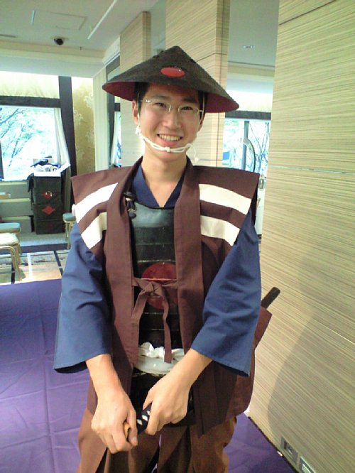 お祭りの貸し出し用の甲冑装束なので、胴や兜以外の、篭手、脛当て、佩盾は結構簡素なものでした。