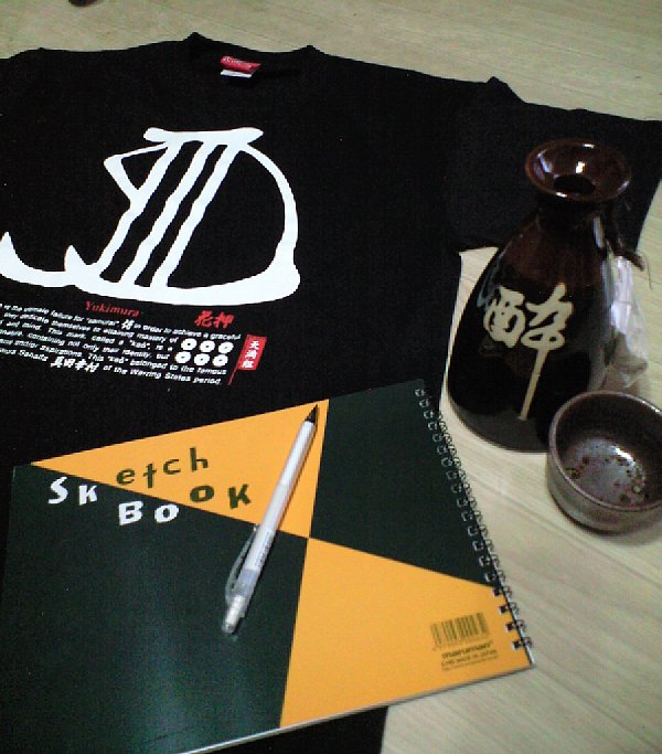 真田幸村の「花押」がプリントされたTシャツと、スケッチブックとシャーペンセット、ぐい呑みと徳利と手作りクッキー、というなんとも超感激な品揃え。クッキーはガツガツッと食べたんで写真には載ってねぇZE。