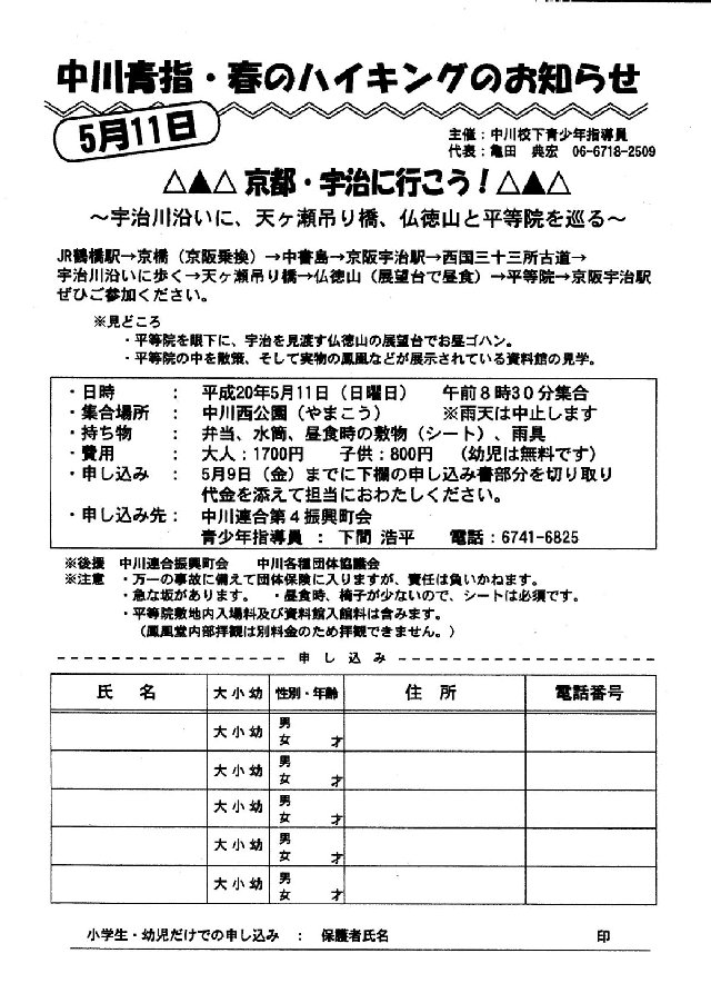 さて中川青少年指導員の春のハイキングのお知らせ。