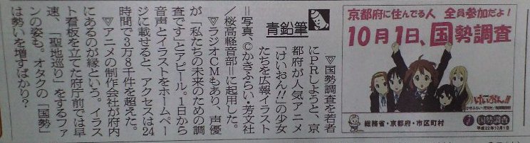 今朝の朝日新聞に「けいおん!!」のキャラがPRしているイラストが載ってたので、つい写メでパシャ。