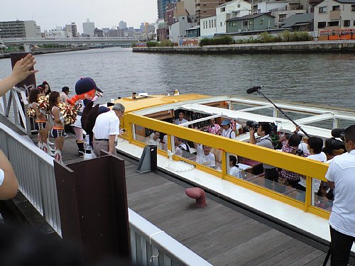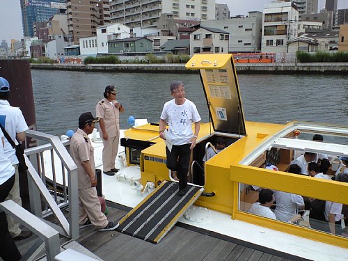 大阪ドーム千代崎港に着いたら、平松市長が水上バスで登場しました。